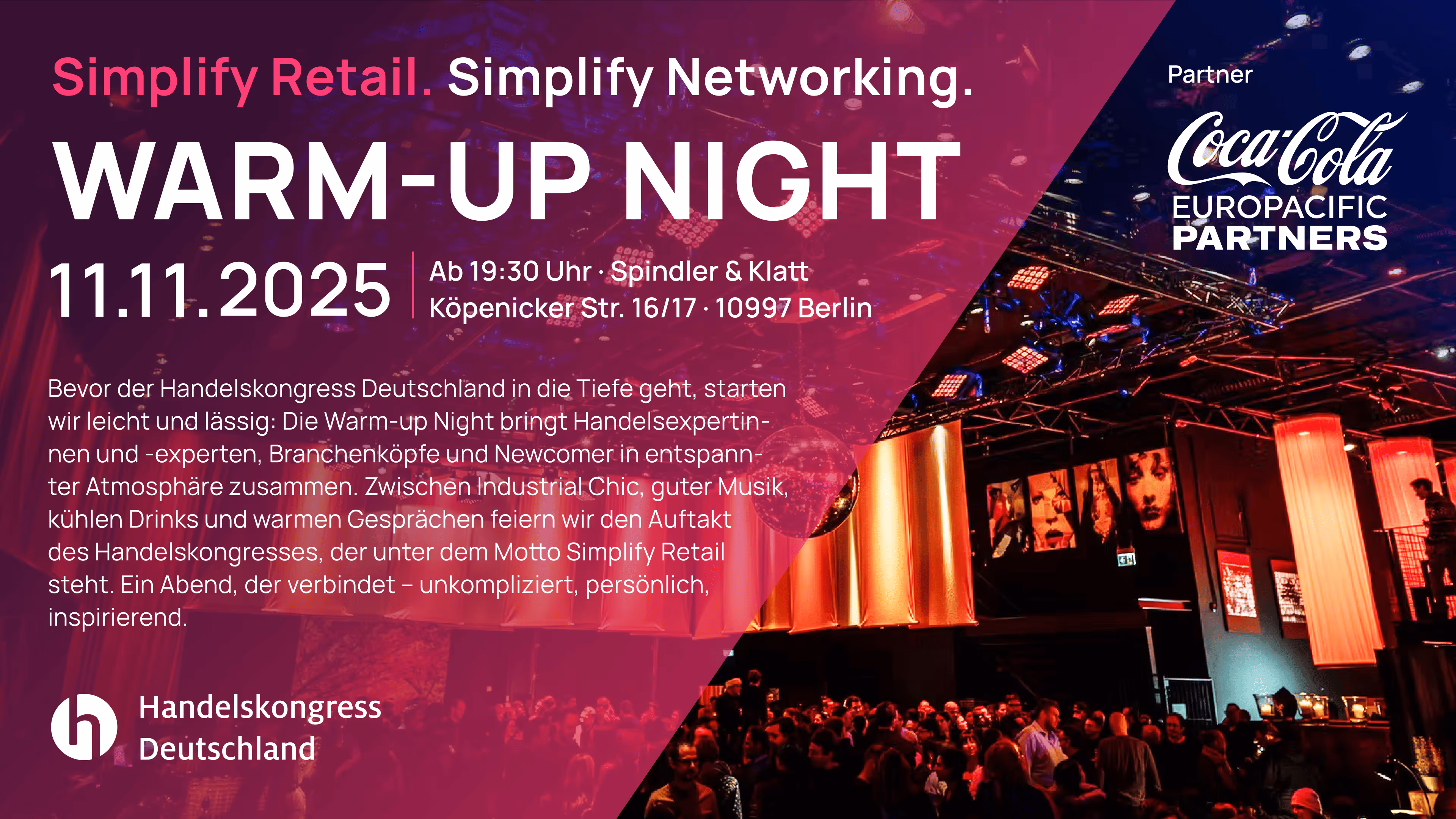 Am 11. November, dem Vorabend des Handelskongresses Deutschland 2025, startet die Branche mit der offiziellen Warm-Up Night presented by Coca-Cola Europacific Partners Deutschland im Spindler & Klatt in Berlin. In entspannter Atmosphäre können Kongressgäste bei Musik, gutem Essen und Drinks erste Gespräche führen und Kontakte knüpfen, bevor es in zwei intensive Kongresstage geht. Die Teilnahme ist für alle Kongressgäste kostenfrei.