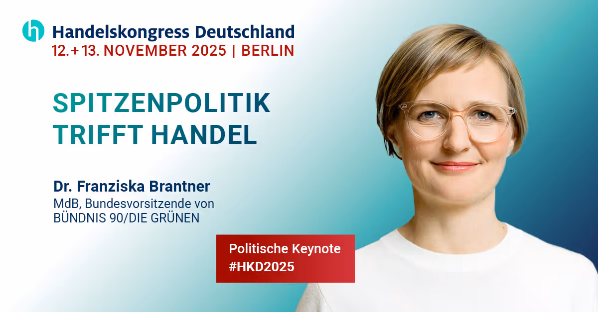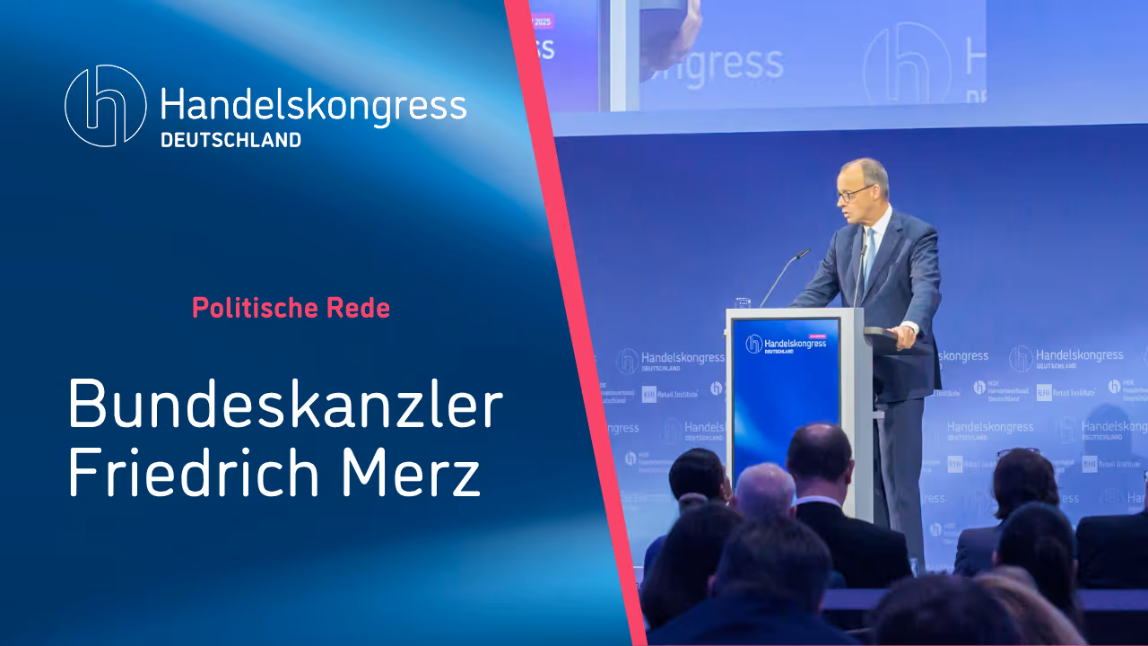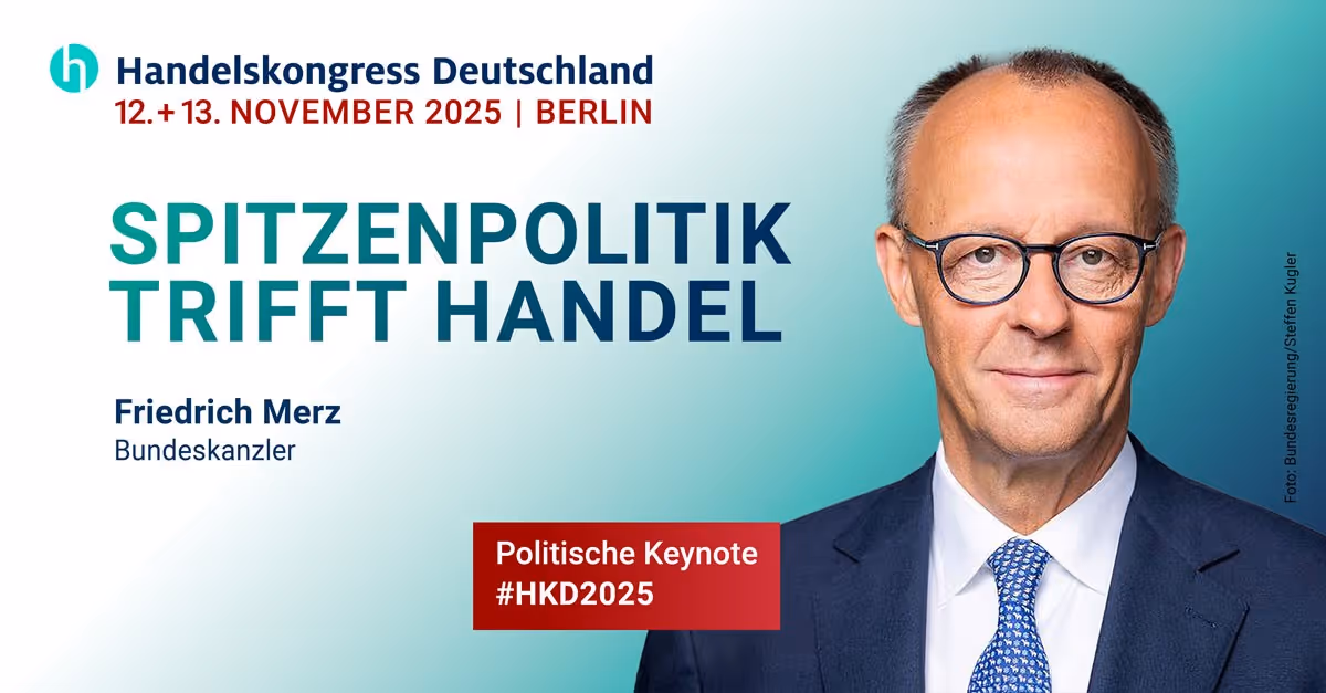 Der Handelskongress Deutschland 2025 bringt die Branche zusammen – und in den direkten Dialog mit der Spitzenpolitik. Wir freuen uns, dass Bundeskanzler Friedrich Merz den Kongress mit einer politischen Keynote abschließen wird. Seine Teilnahme ist ein deutliches Signal für die zentrale Rolle des Handels in Wirtschaft und Gesellschaft.
