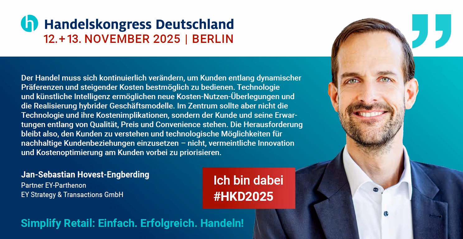 Innovationen und neue Technologien verändern den Handel rasant – doch der Kunde bleibt der wichtigste Maßstab. Wer ihn in den Mittelpunkt stellt, schafft nachhaltiges Wachstum und Vertrauen. Wir freuen uns, Jan-Sebastian Hovest-Engberding von EY beim diesjährigen Handelskongress zu begrüßen, der im Strategieforum wertvolle Insights zum Thema Entwicklung mit Kundenbindung teilen wird.