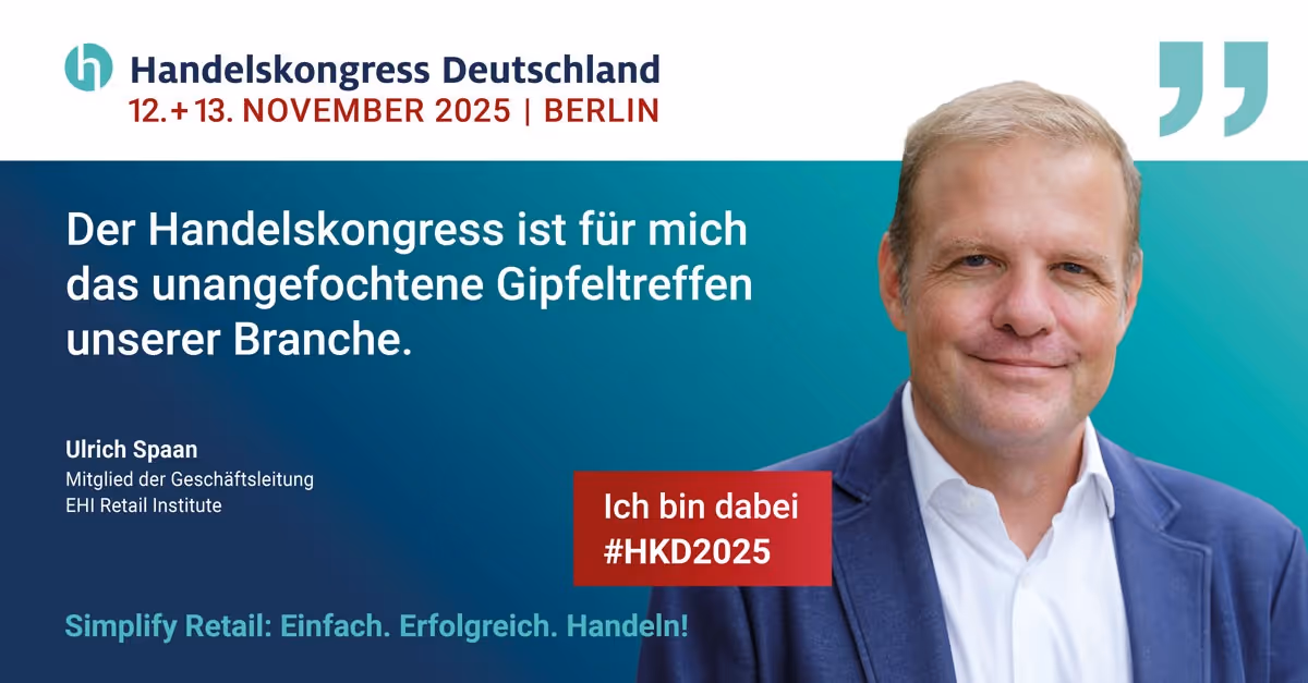 Mit großer Freude begrüßen wir Ulrich Spaan, Mitglied der Geschäftsleitung des EHI Retail Institute, als unseren geschätzten Mitveranstalter des Handelskongress Deutschland. In seinem Beitrag zeigt er anschaulich, wie Simplify Retail gelingt – durch vereinfachte Prozesse, die Entlastung der Mitarbeitenden und den gezielten Einsatz moderner Technologien. So entsteht ein Handel, der effizienter, menschlicher und bestens gerüstet für die Zukunft ist.