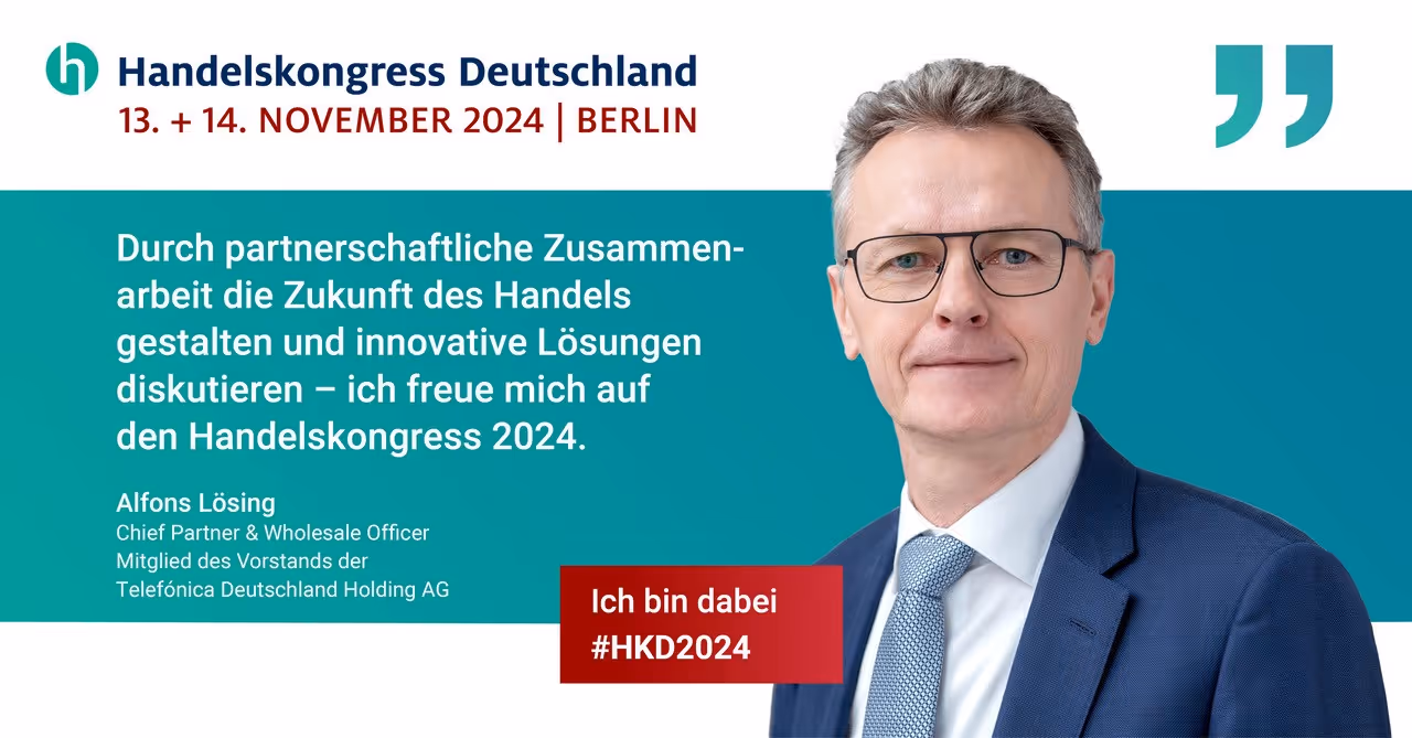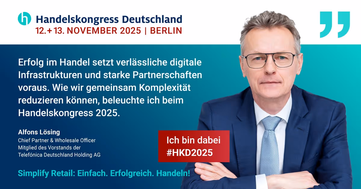 Beim Handelskongress Deutschland 2025 spricht Alfons Lösing, Chief Partner & Wholesale Officer bei o2 Telefónica Deutschland, im Panel „Smart, Simple, Seamless –Handel zwischen Innovation und Disruption“ über die Bedeutung digitaler Infrastrukturen und partnerschaftlicher Geschäftsmodelle für den Handel der Zukunft.